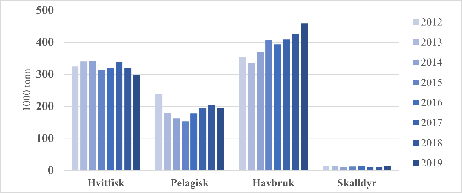 Tilgjengelig restråstoff fra fiskeriene styres i stor grad av kvotene, hvor sektorene hvitfisk og pelagisk så en nedgang fra 2018 til 2019. Produksjonene i havbrukssektoren fortsatte økningen for fjerde året på rad, som bidro til å opprettholde mengde tilgjengelig restråstoff, totalt.