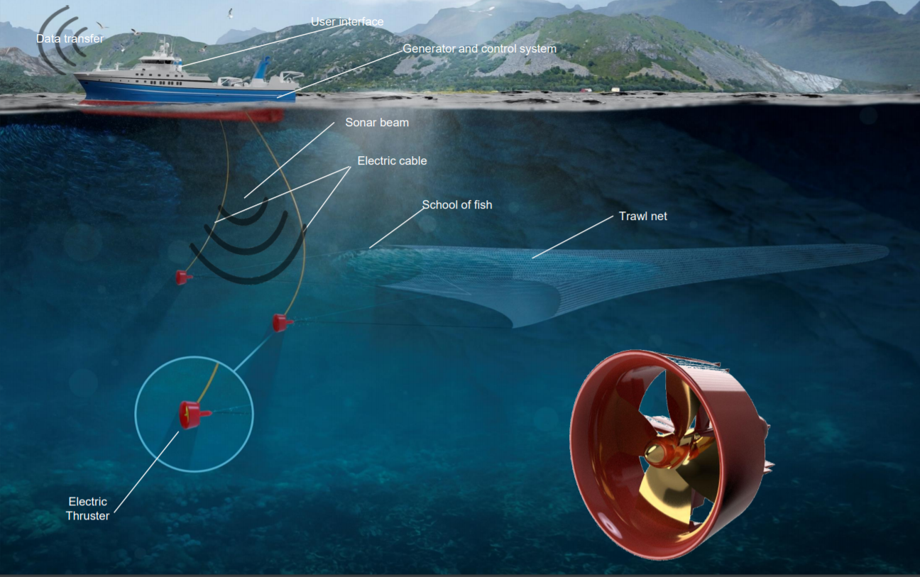 Eco Trawl konseptet består i å erstatte de konvensjonelle tråldørene i pelagisk- og bunntrål med to thrusterenheter for å redusere energiforbruket, samt ha mer kontroll på trålen (se figur 1). Prosjektet er et Prosjekt i Bedrift som har vært ledet av selskapet Eco Trawl som har samarbeidet med Havforskningsinstituttet og CFD Marine.