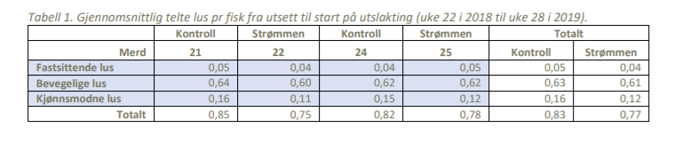 Det var lite lus på både kontrollmerdene og Strømmenrør merdene gjennom førsøksperioden, og målsettingen om å ha en hel generasjon i sjø uten å måtte behandle ble oppnådd på hele anlegget. Det var 8 meter skjørt på både Strømmenrør og kontrollmerder. Det varierte fra uke til uke hvilke merder som hadde mest lus, men det ble vist en forskjell i lusenivå på 7,2 % i favør av Strømmenrør merdene i totalt antall lus i tidsperioden fra utsett til splitting (tabell 1).