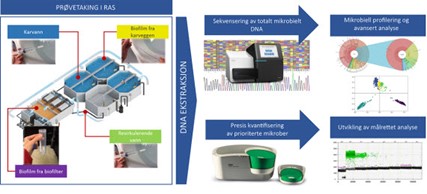En kvantitativ overvåking av bakteriesammensetningen i fem RAS-anlegg over en periode på 15 måneder ble gjennomført. Dette er første gang mikrobiell vannkvalitet er målt hyppig sammenhengende over lang tid. Prosjektet har fulgt mikrobiotaen i både vann, karvegg og i biofilter (se figur).