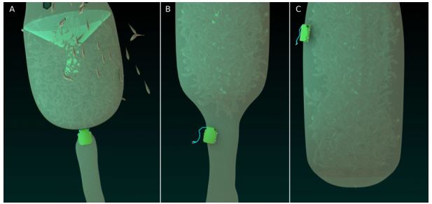 Bilde: Fangstkontroll i snurrevad (A) med påmontert automatisk sekkeutløser som åpnes (B og C)